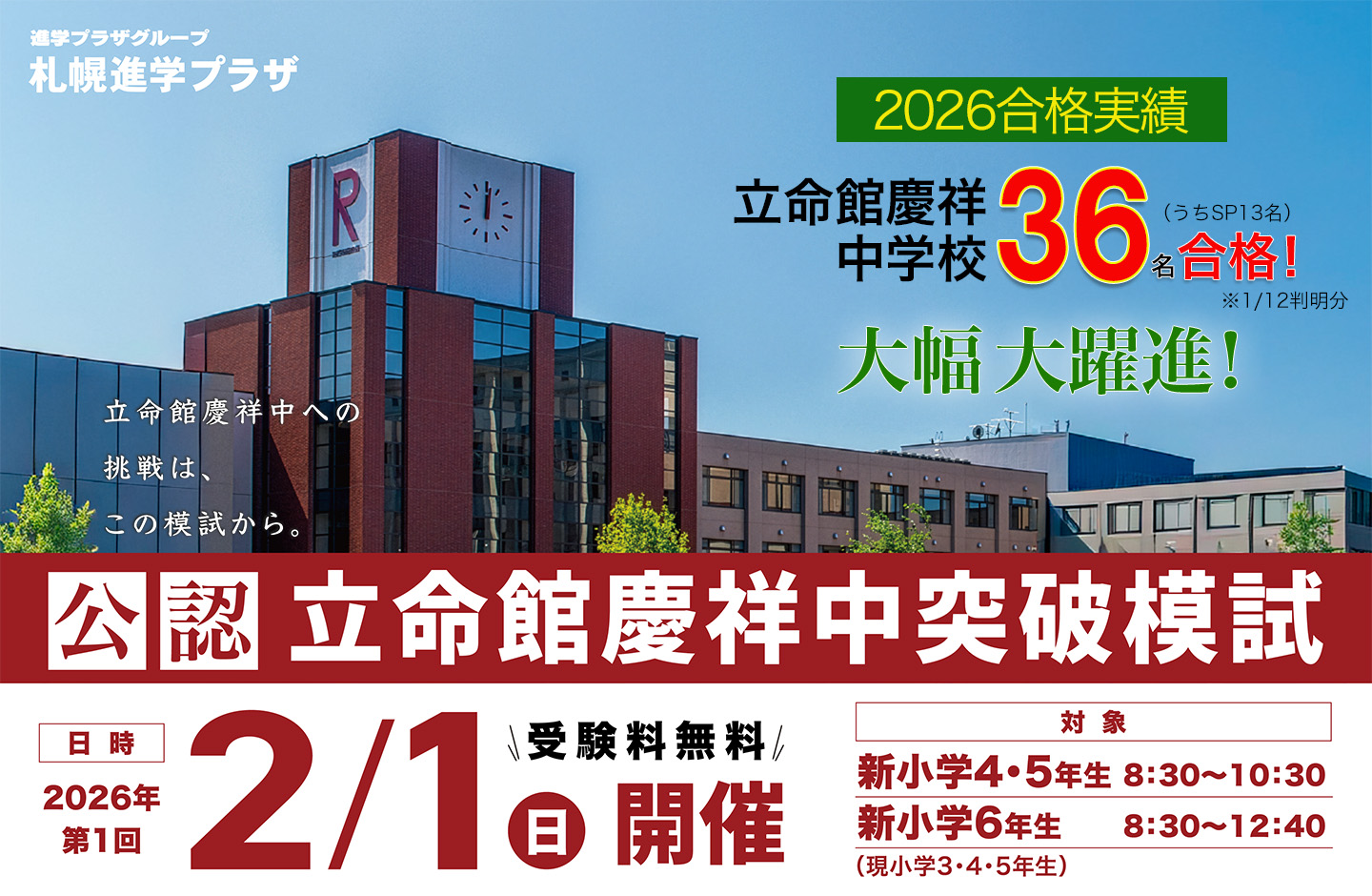 | 対象: | 立命館慶祥中学校の受験を考えている模試申込の新小学4年生~新小学6年生の親子 |